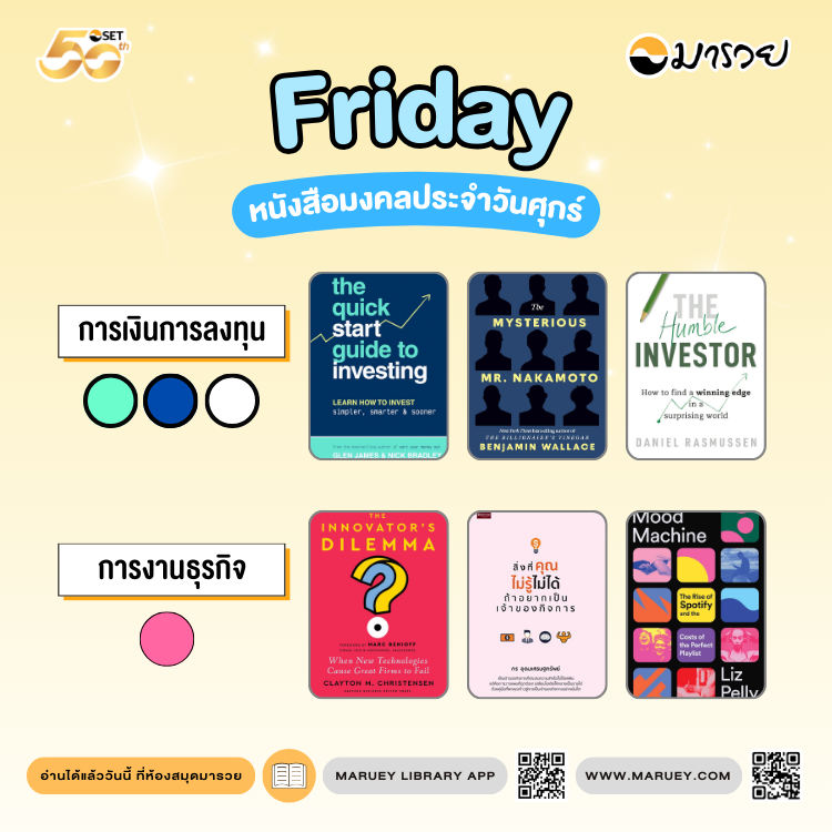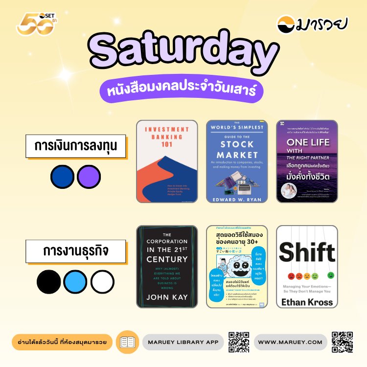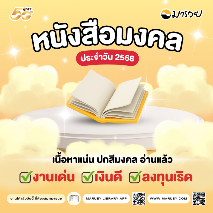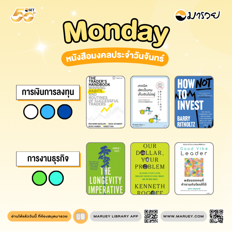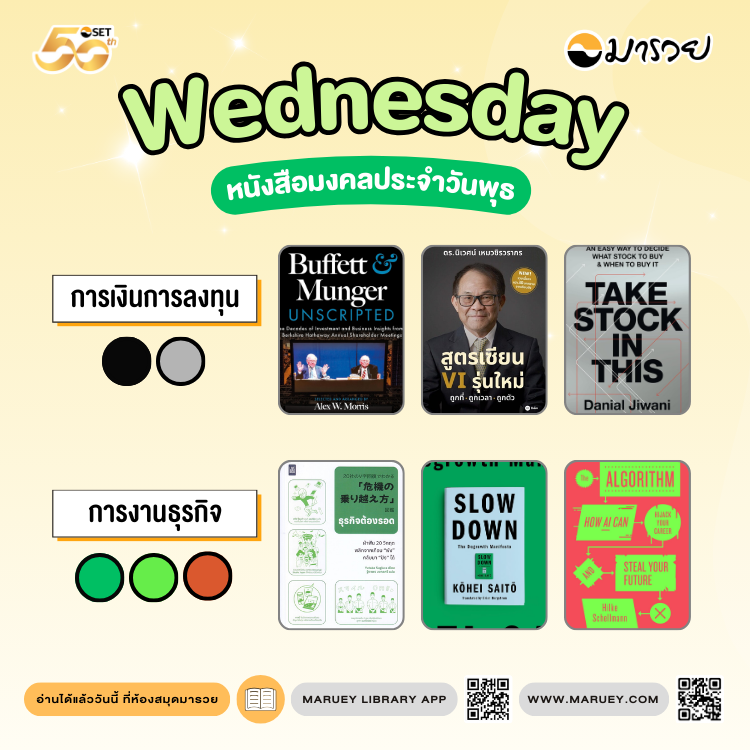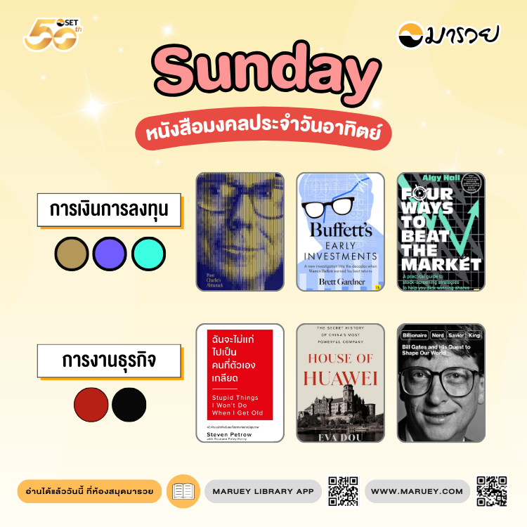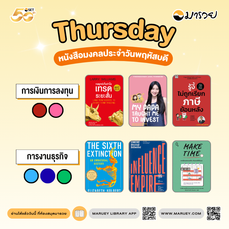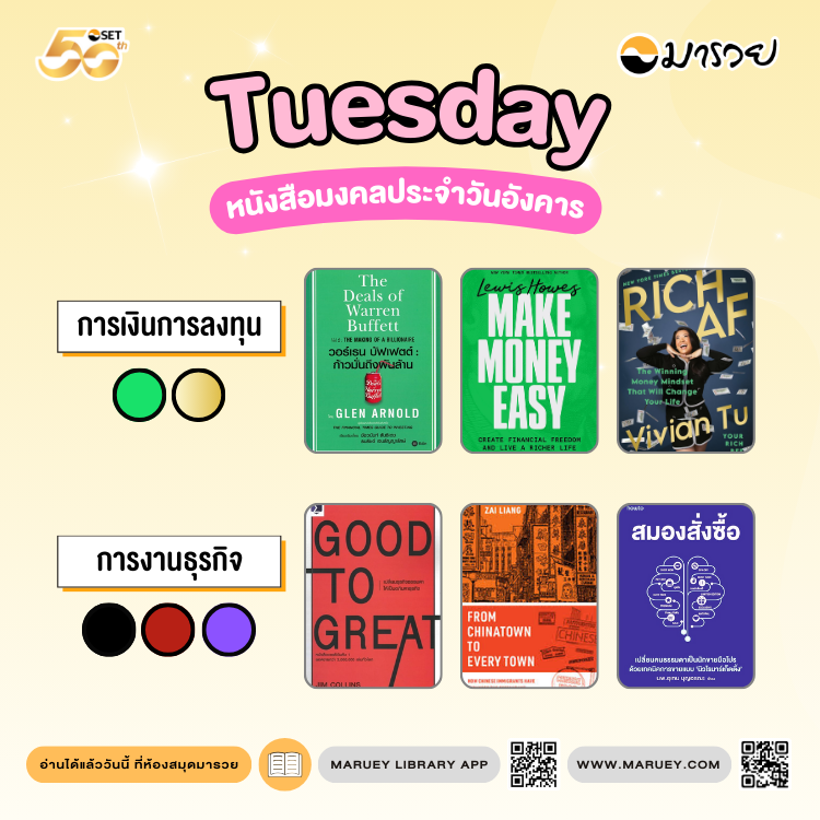 สายมูทั้งหลายห้ามพลาด! ห้องสมุดมารวยคัดสรรหนังสือมงคลประจำวันมาให้ครบทั้งสัปดาห์ จัดเต็มทั้งปกสีมงคล และเนื้อหาคัดแน่น ๆ ที่ช่วยเสริมทั้งการเงิน การงาน และการลงทุน เรียกได้ว่าอ่านแล้วได้ทั้ง “พลังใจ” และ “พลังสมอง” ไปพร้อมกัน